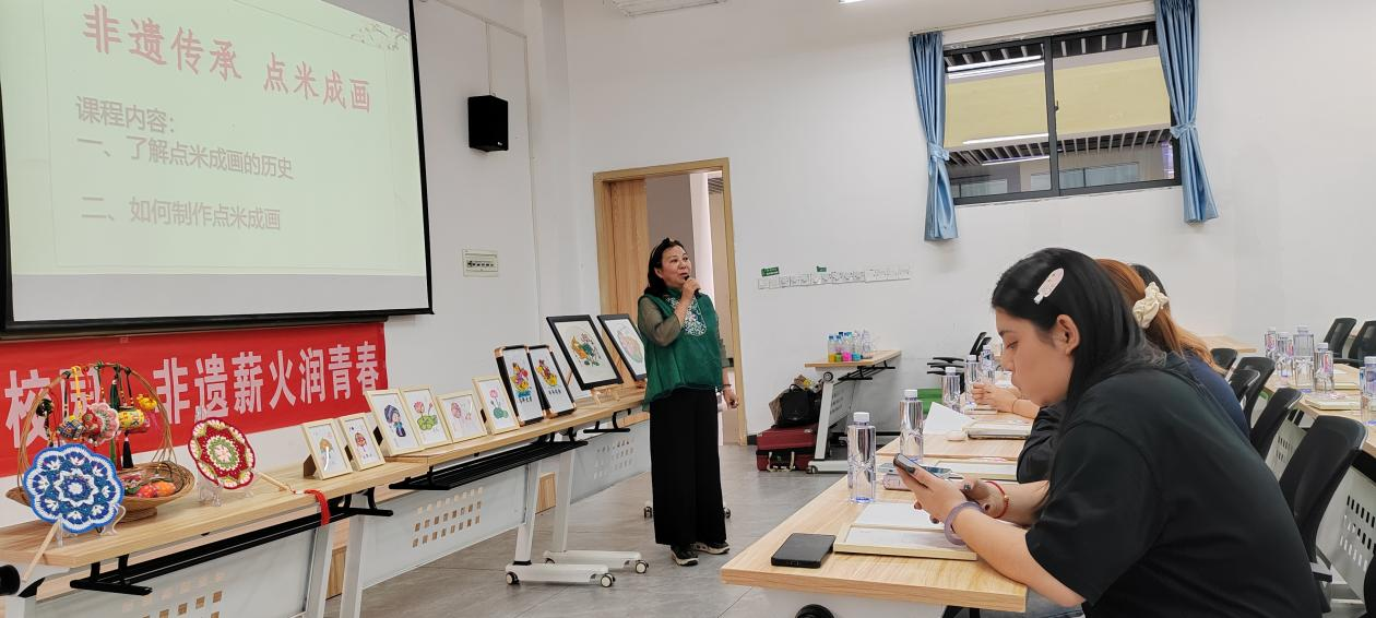 为迎接即将到来的“三月三”,弘扬优秀传统文化,让非遗技艺走进校园、浸润青春心灵,2026年3月31日下午,大学生创新创业项目团队【“点米成画”——广西非遗技艺数字化传承与品牌化建设】在商学院囤荣立和彭晓琼两位老师的指导下,在A4102教室成功举办了“点米成画进校园,非遗薪火润青春”非遗技艺传承主题活动。活动邀请到“点米成画”非遗传承人曹文碧老师来到校园内亲临指导,25级工商专业学生受邀积极参与。