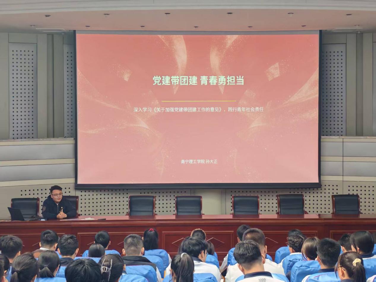 孙大正围绕“党建带团建·青春勇担当”的主题,深入解读了《意见》的出台背景、重大意义及核心内容,强调了强化思想引领、筑牢信仰之基的重要性,以及加强组织建设、夯实团建基础的必要性。他结合个人党团学生干部经历与专业学习,深情阐述了“青年兴则国家兴,青年强则国家强”的深刻内涵,鼓励青年学子要持续强化理论学习,不断提升政治素养,积极参与党团活动,在志愿服务、社会实践与科技创新中锤炼自我、增长才干。同时,呼吁青年学子时刻以高标准严格要求自己,发挥模范带头作用,用实际行动践行新时代青年的使命与担当。