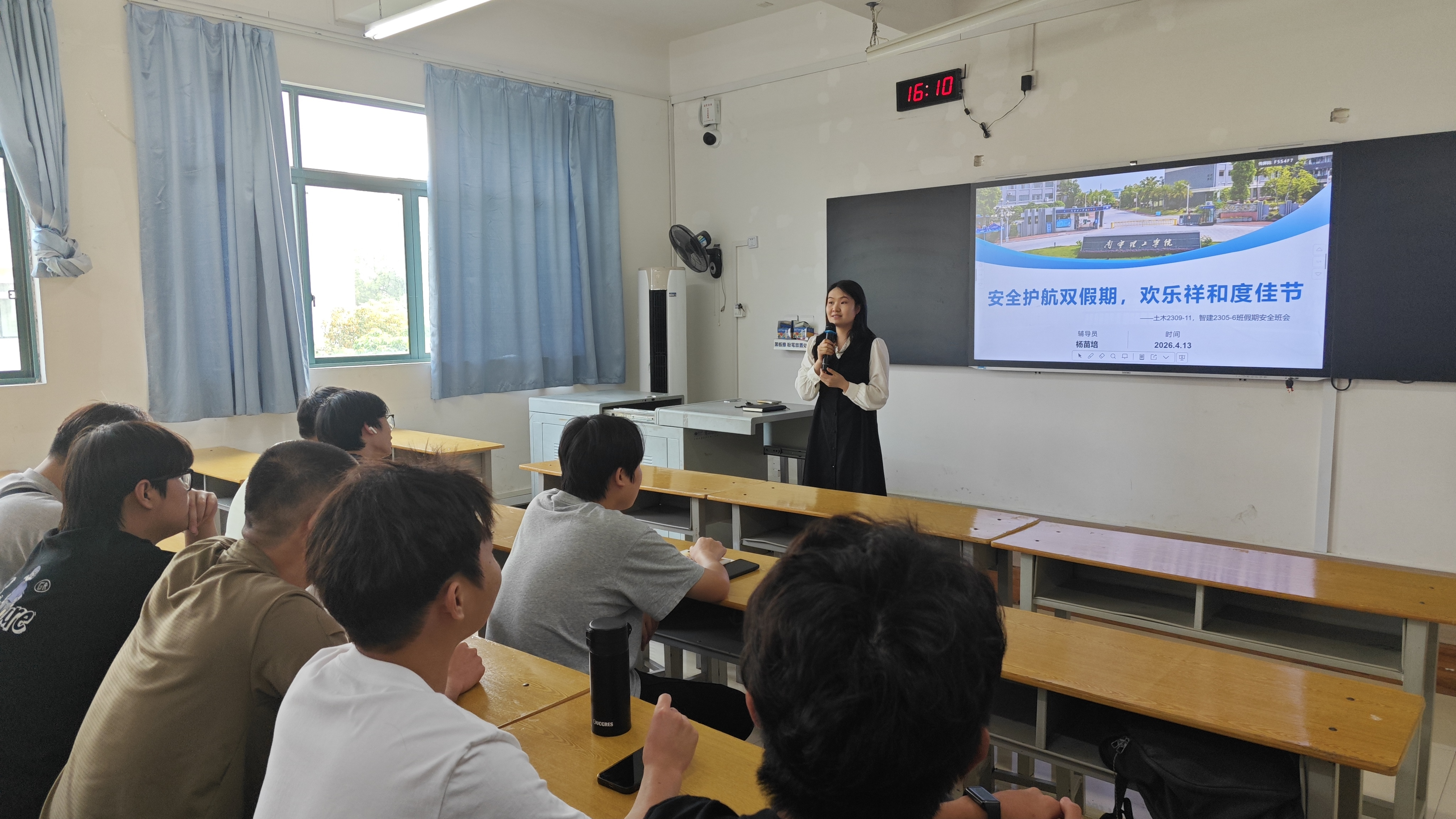 班会上,辅导员围绕出行安全、民俗活动参与、防火防溺水、防范电信诈骗、食品安全、留校管理等方面进行了系统讲解。针对假期出行集中、民俗活动密集的特点,辅导员提醒同学们:出行前关注气象和应急部门提示,选择正规交通工具,骑电动车戴头盔,不骑机车;参与对歌、抛绣球等民俗活动时,选择官方场所,避免拥挤踩踏。